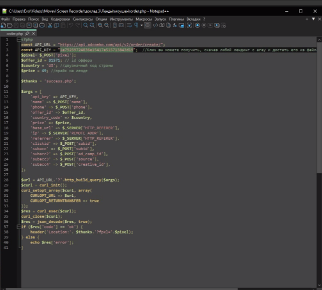 En el archivo del editor de texto, cambie el ID de la oferta por el ID del panel de control de la red de afiliados. En “country”, agregue el código de letra de la región geográfica (en nuestro caso, EE. UU.). Especifique el precio en “price” con números sin símbolos monetarios: 49.