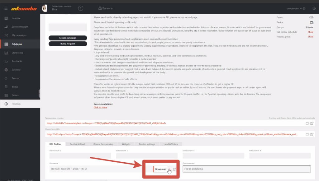 Haz clic en “Apply” y copia el enlace. A continuación, comprueba en Keitaro y AdCombo que se estén enviando los leads.