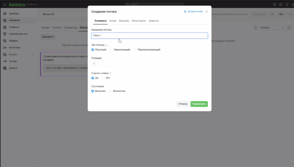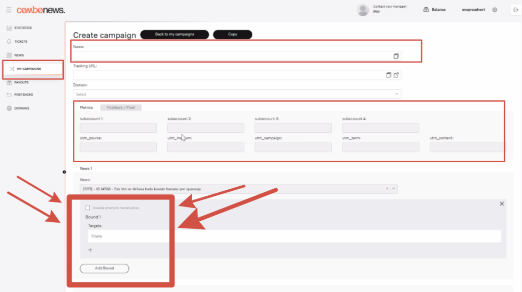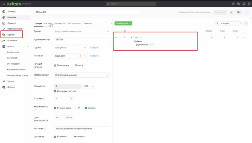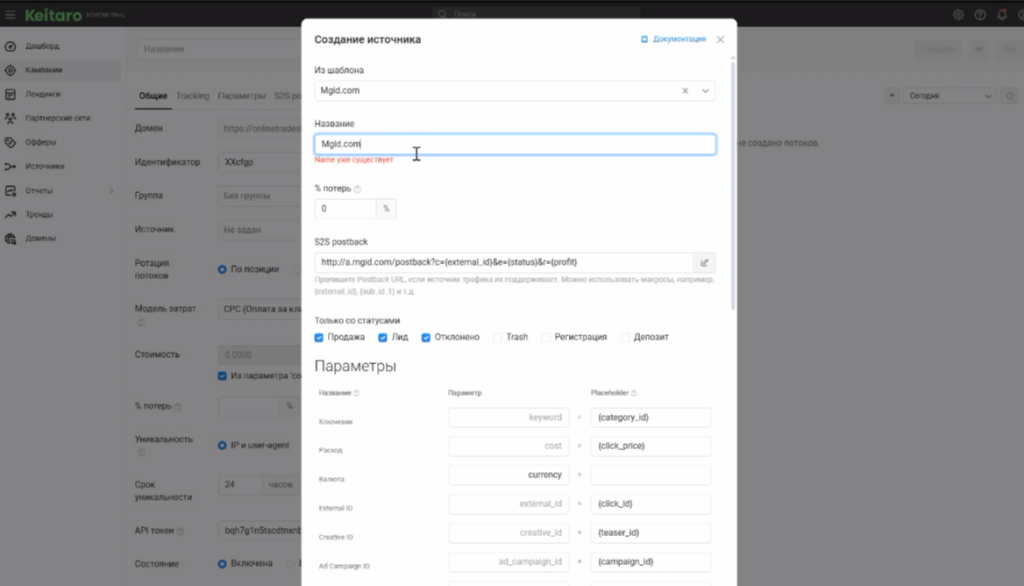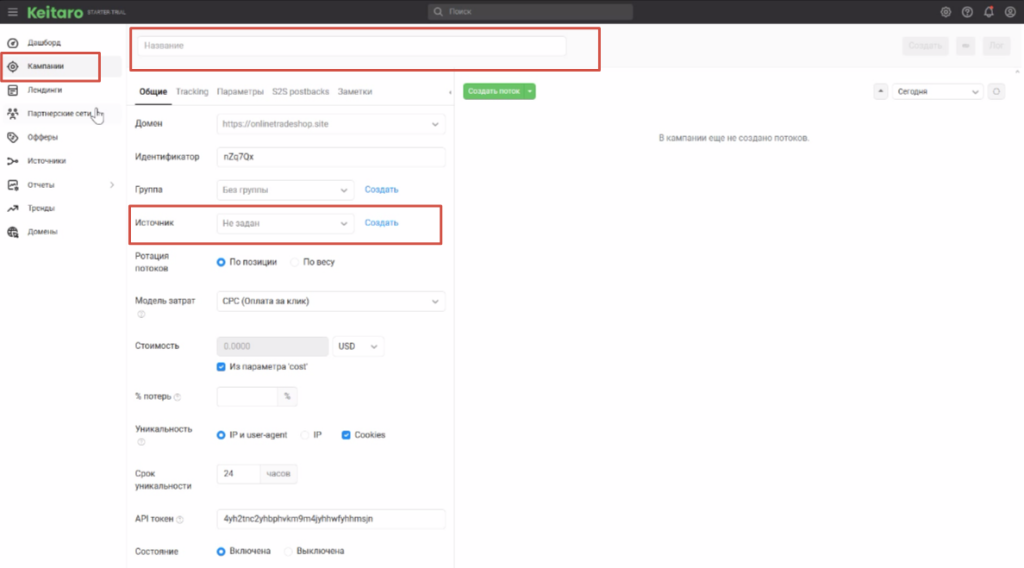 Ahora necesitas especificar las macros de Keitaro. Para ello, regresa al rastreador y crea una campaña de prueba lista para usar.