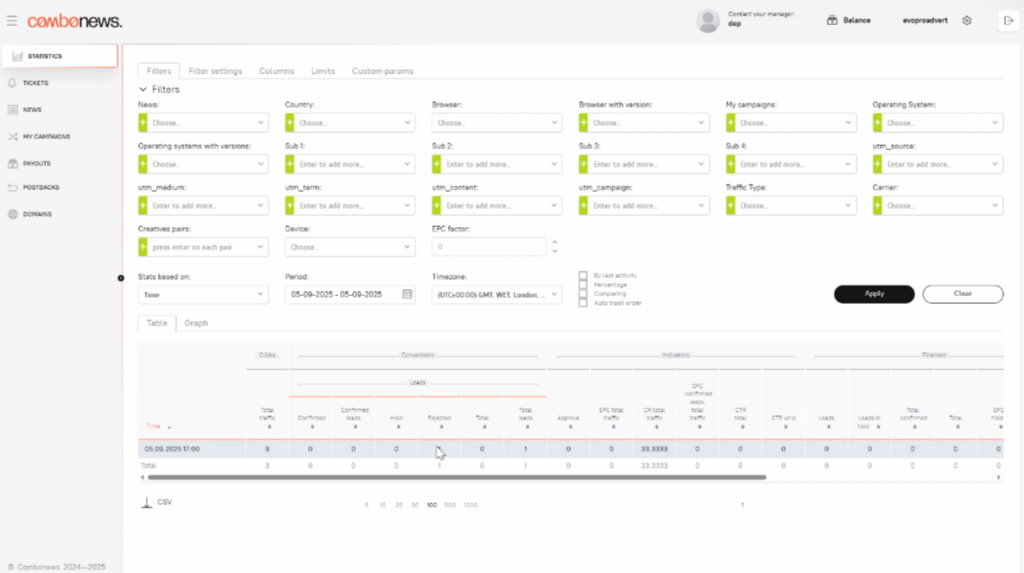 En la sección “Statistics”, puedes ver el número de clics y los clientes potenciales de prueba. Concéntrate en el número de clics y el CTR de tu tráfico. Cuanto mayor sea el CTR, más visitantes leerán las noticias y más ventas generará la tienda.