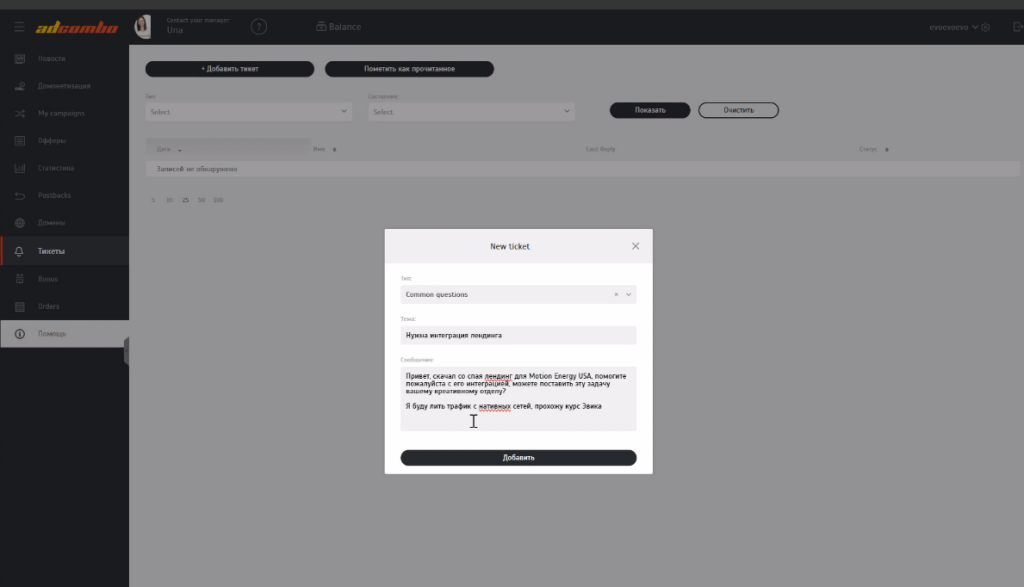 Enviamos una solicitud de integración con redes CPA. En nuestro caso, volvemos a Adcombo y creamos un ticket.