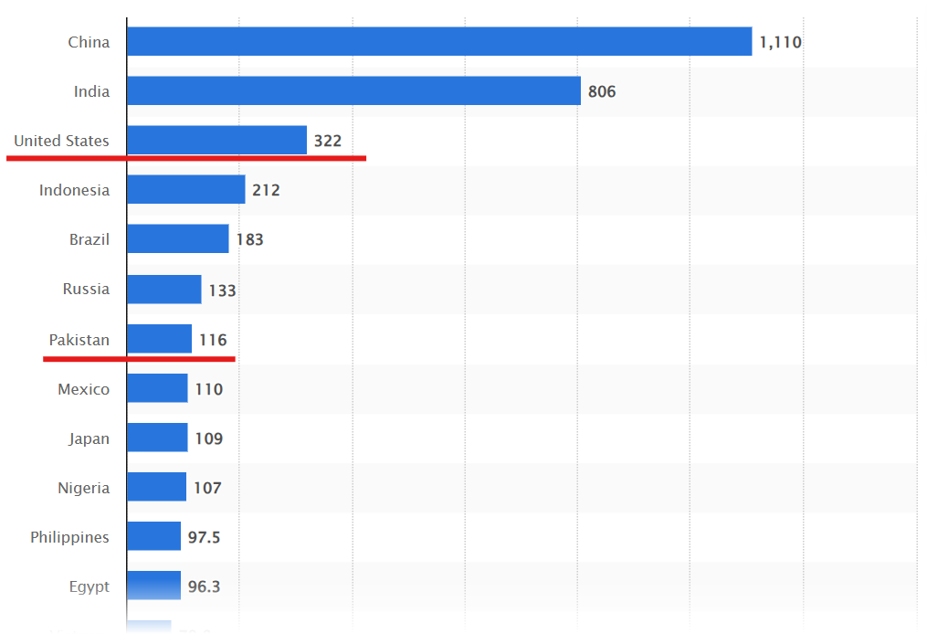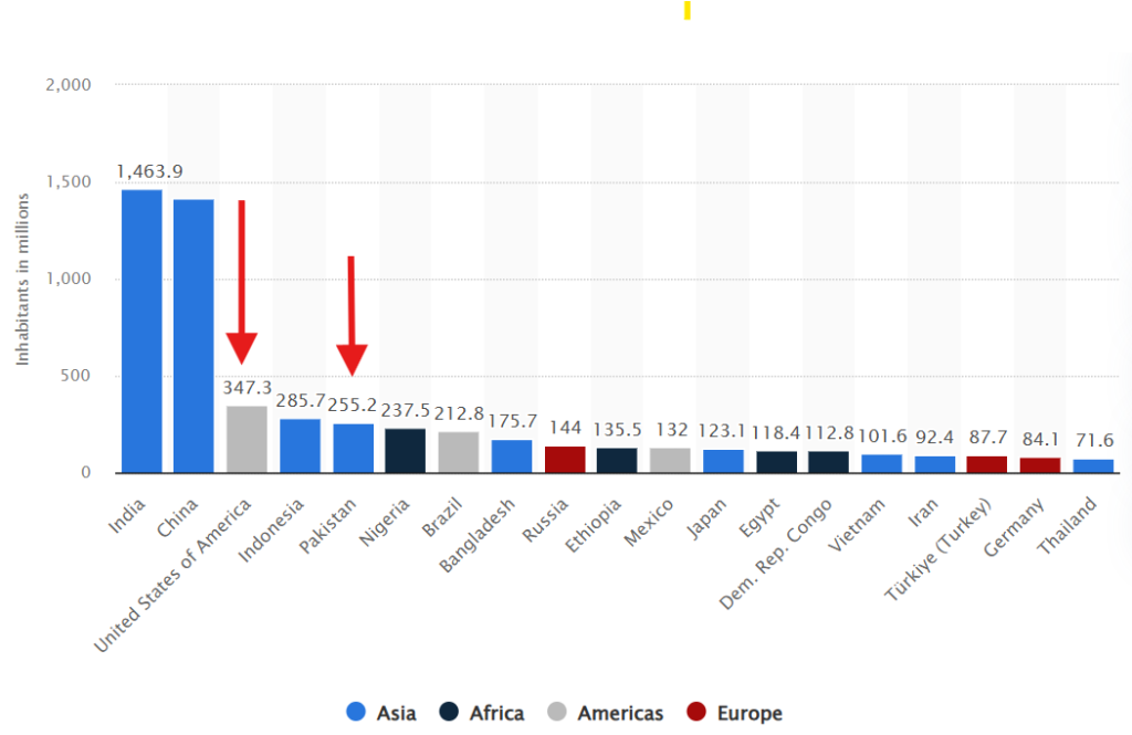 Por ejemplo: Estados Unidos y Pakistán tienen aproximadamente la misma población.